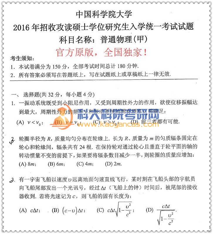 2016年中科院《普通物理甲》考研真题(官方原版)(含答案解析)