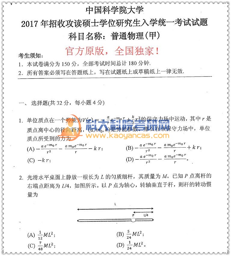 2017年中科院《普通物理甲》考研真题(官方原版)(含答案解析)