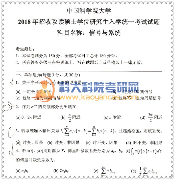 2018年中科院《信号与系统》考研真题原版(含答案解析)