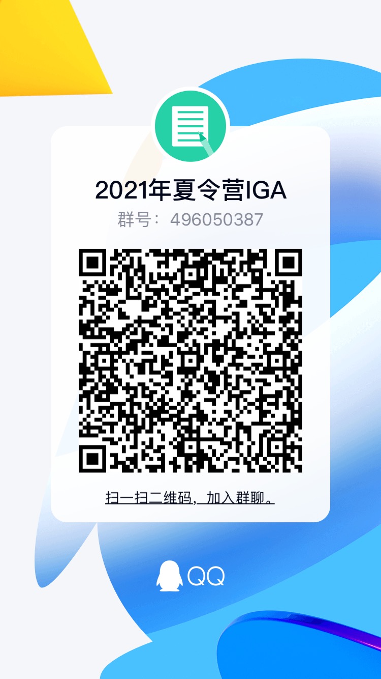 4.请夏令营申请者同时加入“2021年夏令营IGA”QQ群:496050387。入群申请为:夏令营+姓名+本科专业+本科学校名称。