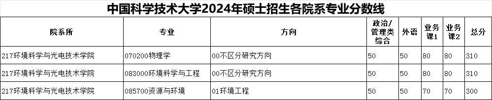 对于2025年将要考研的同学来讲,复试分数线是重要的参考数据。我们科大科院考研网专门为大家整理了近三年复试分数线供大家参考,为报考时多参考一些数据,对报考择校来讲是很值得做的一件事情。下面就是2022-2024年中国科学技术大学环境科学与光电技术学院研究生招生分数线考研。